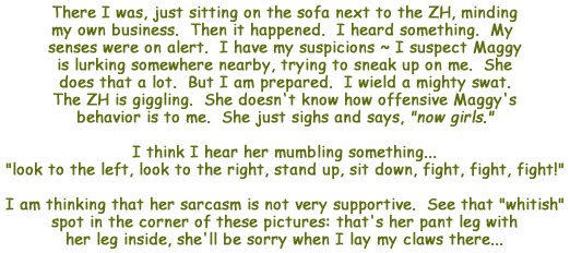 Hope your claws don't put that much of a hurty on the leg in the white pants. Blood is a pain to get out of white clothes! Mom may need your mom's experience to update our page (WE HAVE A NEW ADDIDTION!)